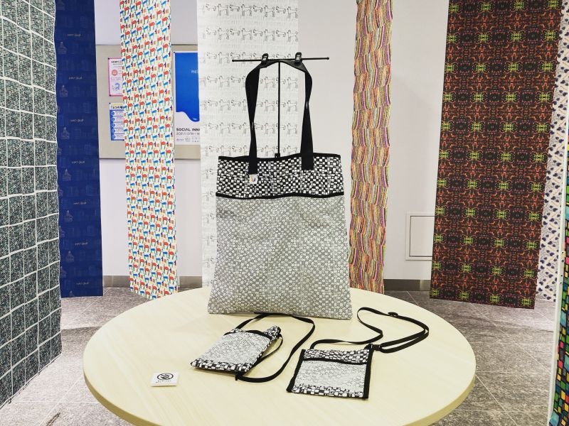 今回はサスティナブルな取り組みとして、展示終了後のタペストリーを利用し、わたしたちアトリエ福花がオリジナルのトートバッグやサコッシュに仕立てます。