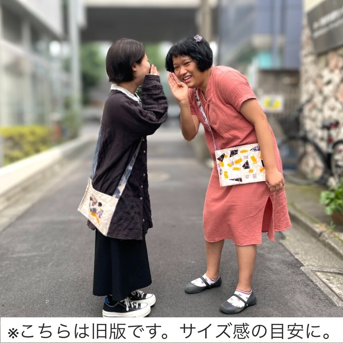 そうしてできた布コラージュ生地から、いろんなアイテムを作っていくのだけれど、こちらは布コラージュの新たな名手「ラッキーちゃん」が、ものすごい速さで次々と作っていくサコッシュ。