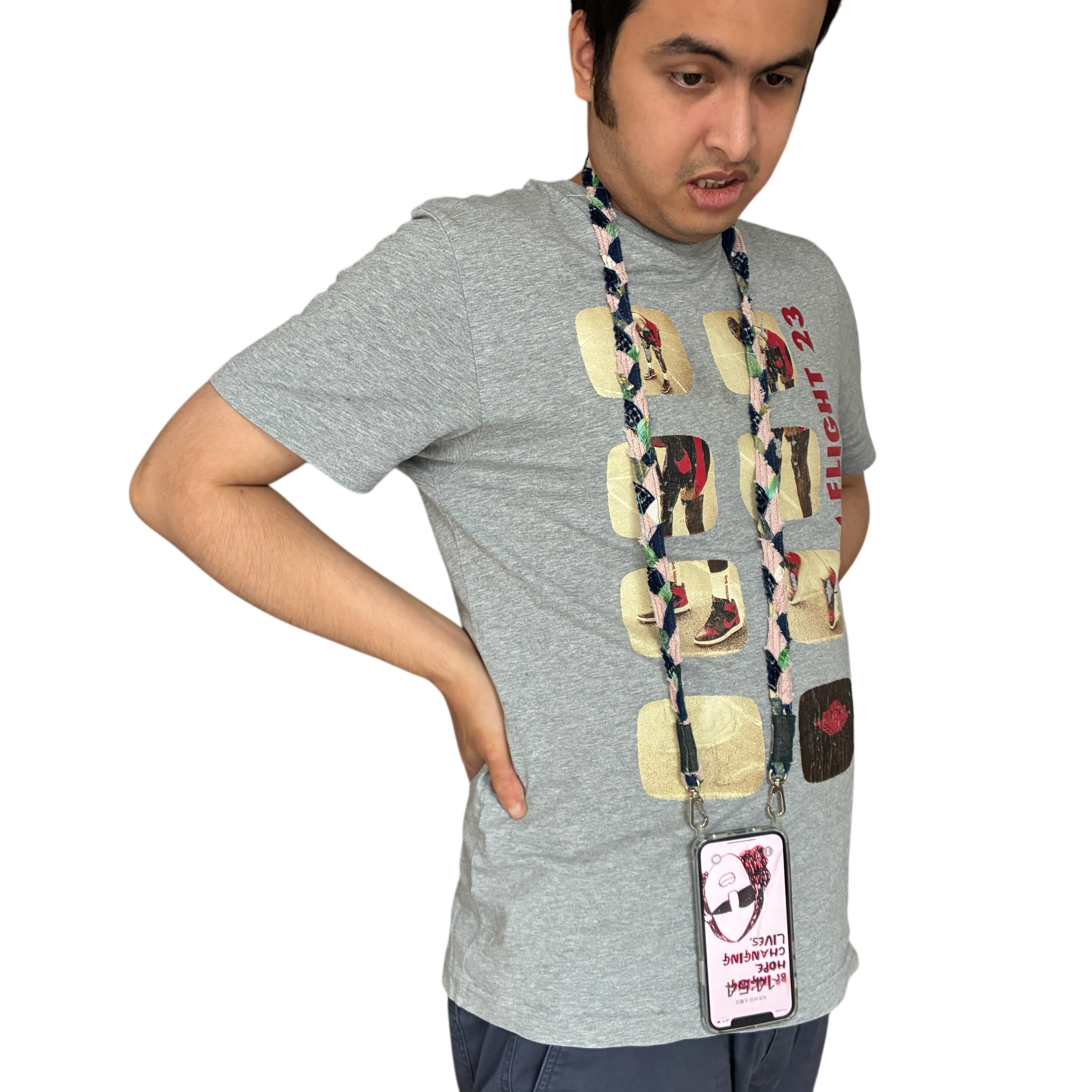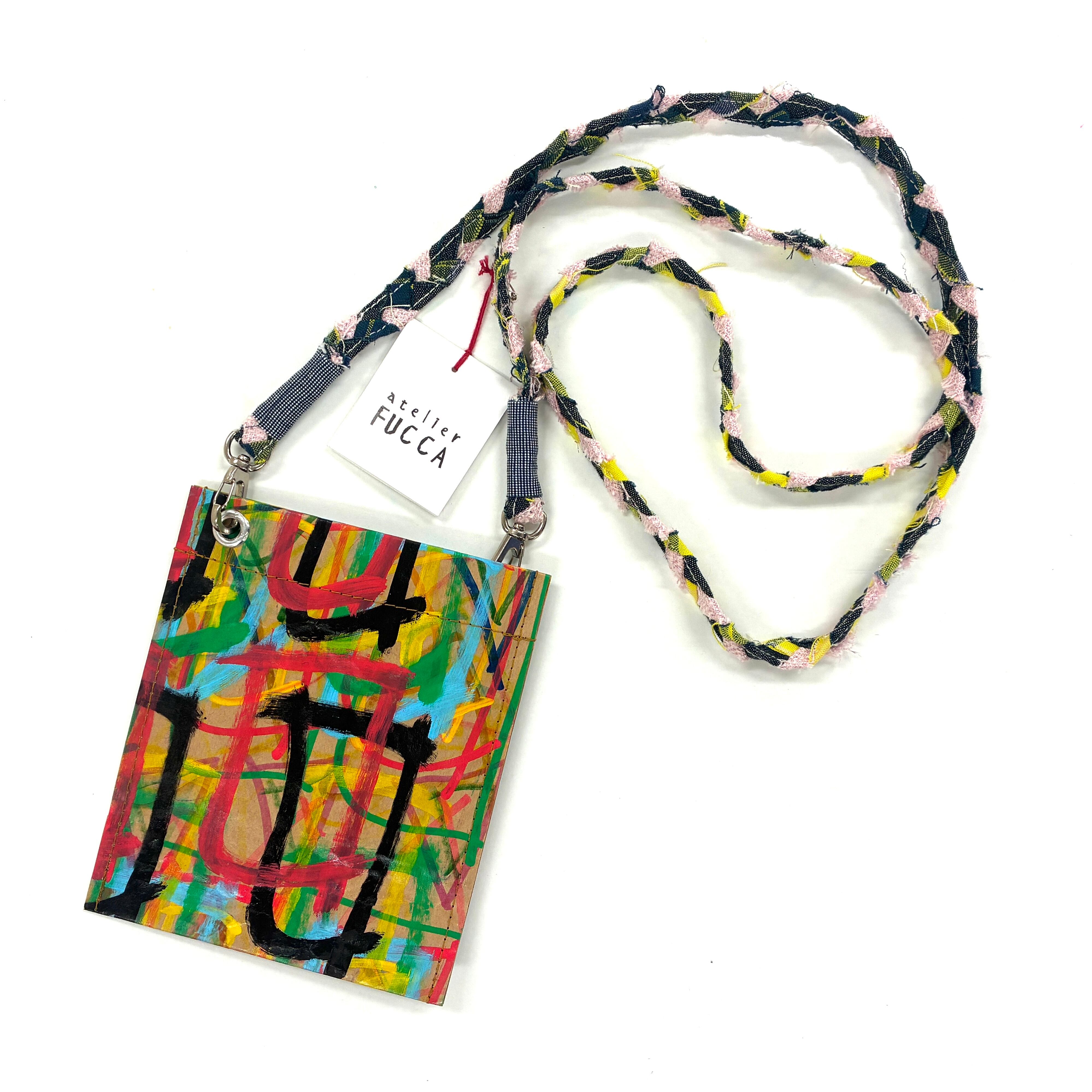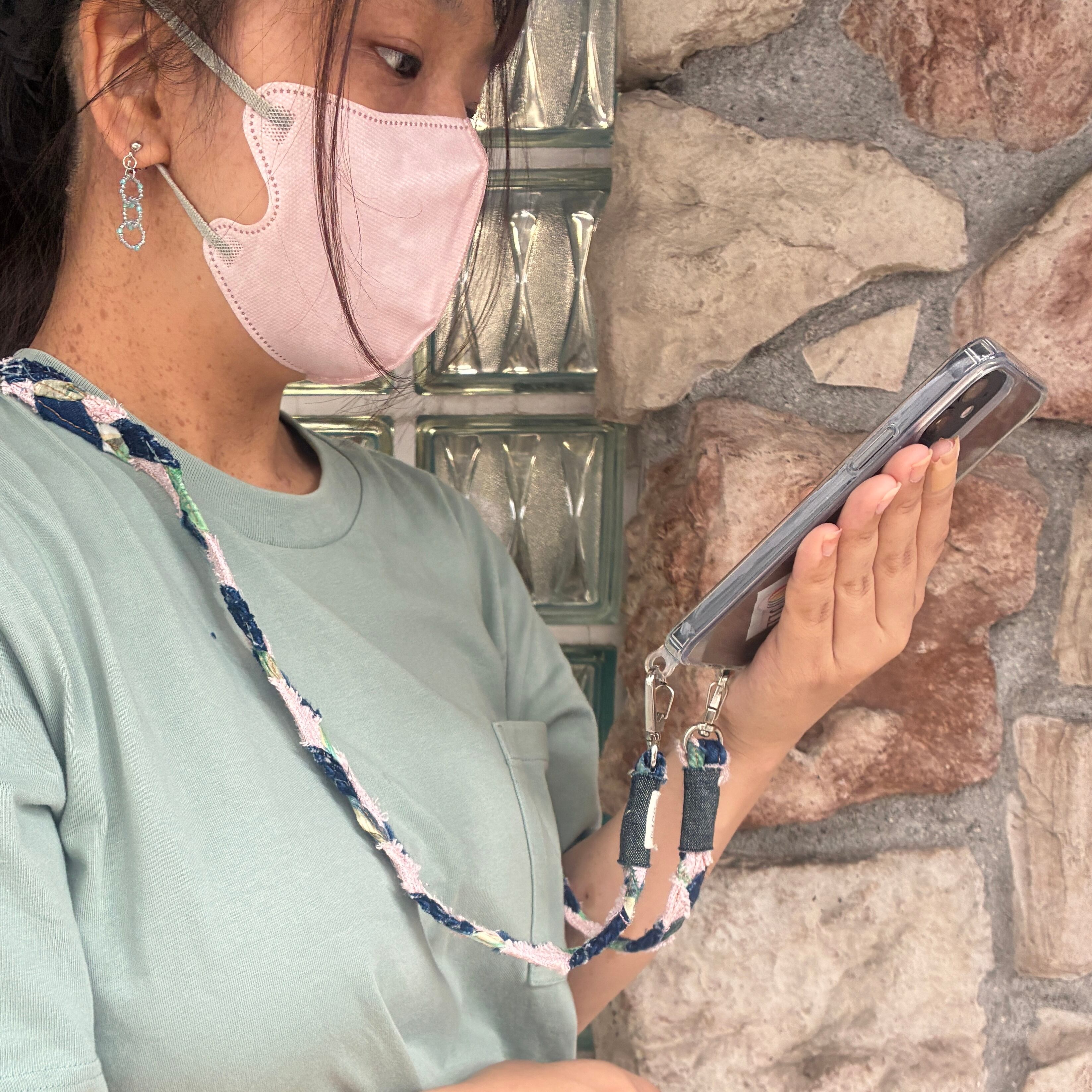 ものづくりの過程で出る余り布やハギレつなげて、編み込んで作ったストラップ。