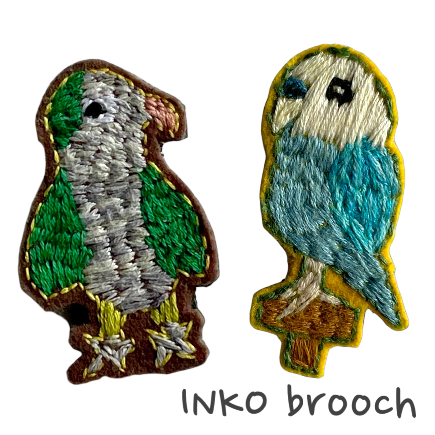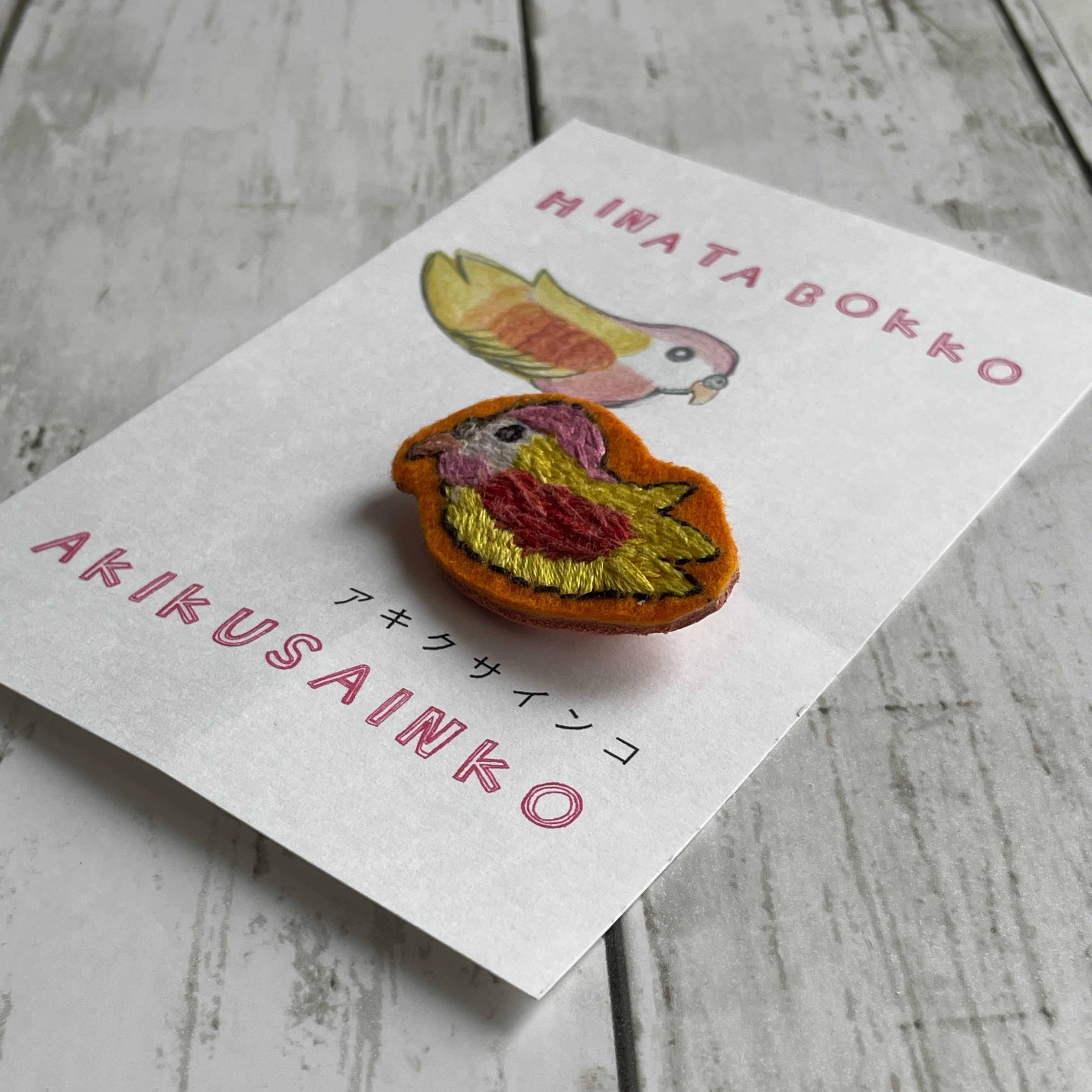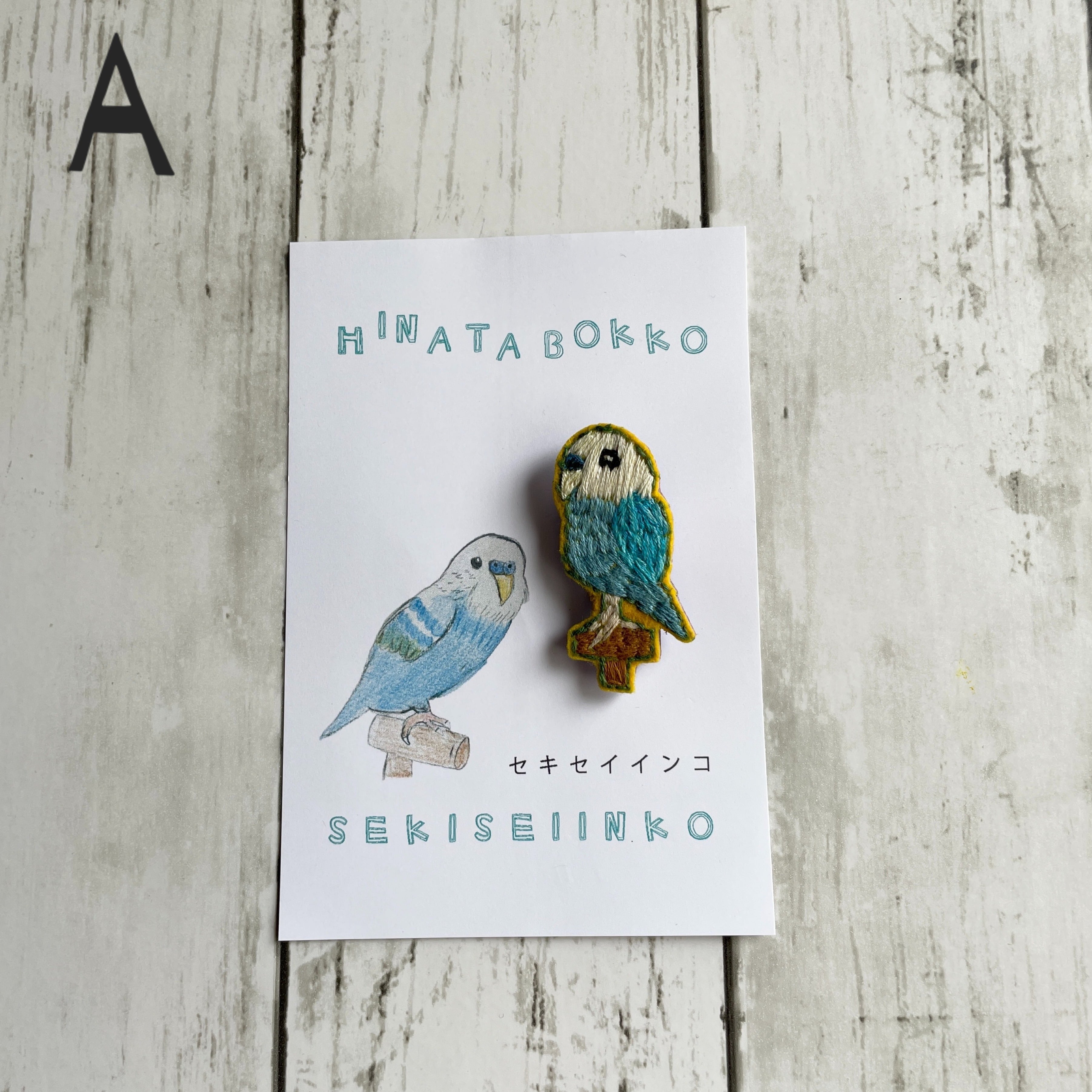 セキセイインコの「ひなた」ちゃんを飼っている、トリが大好きのひなたぼっこさんが作った、トリドリの刺繍ブローチ。