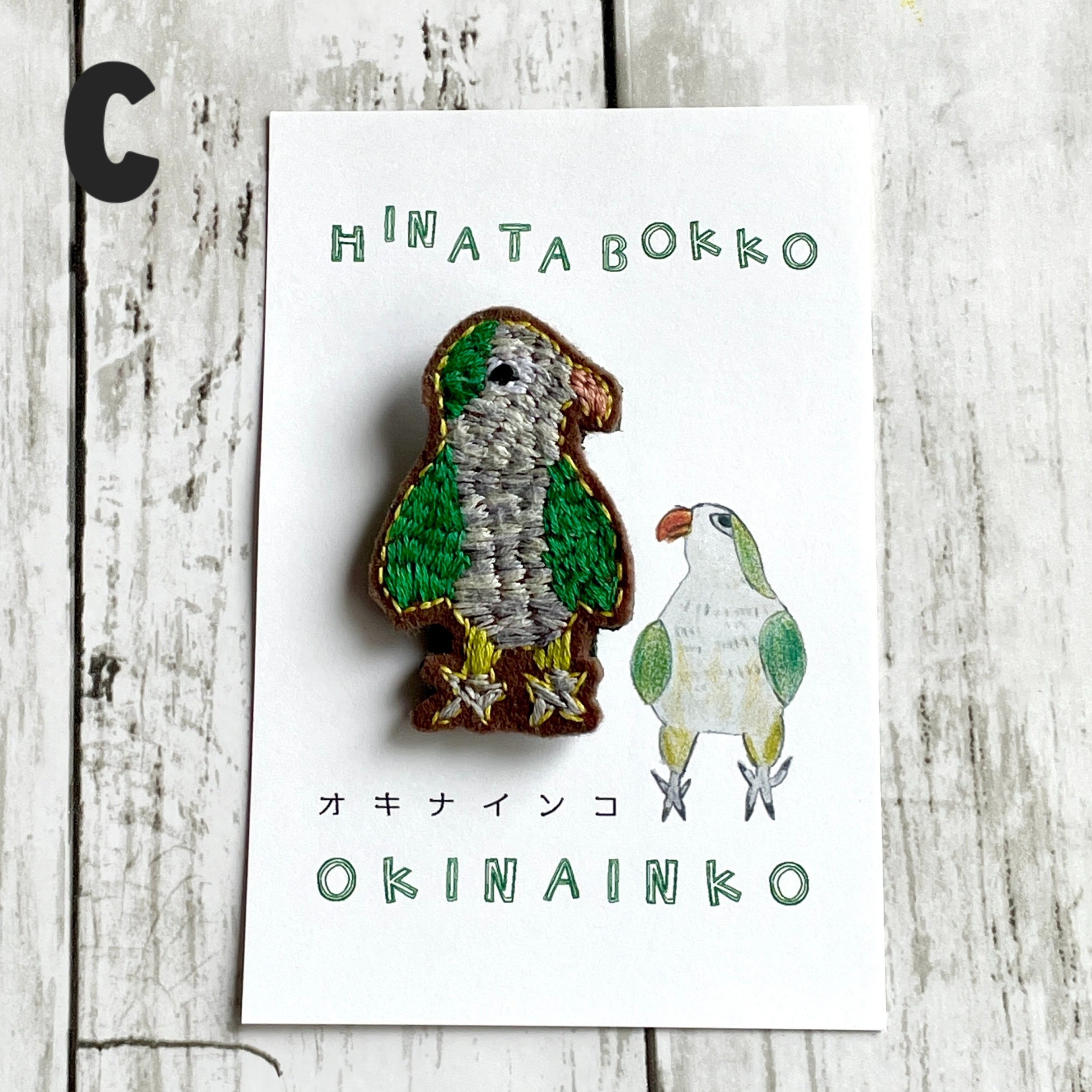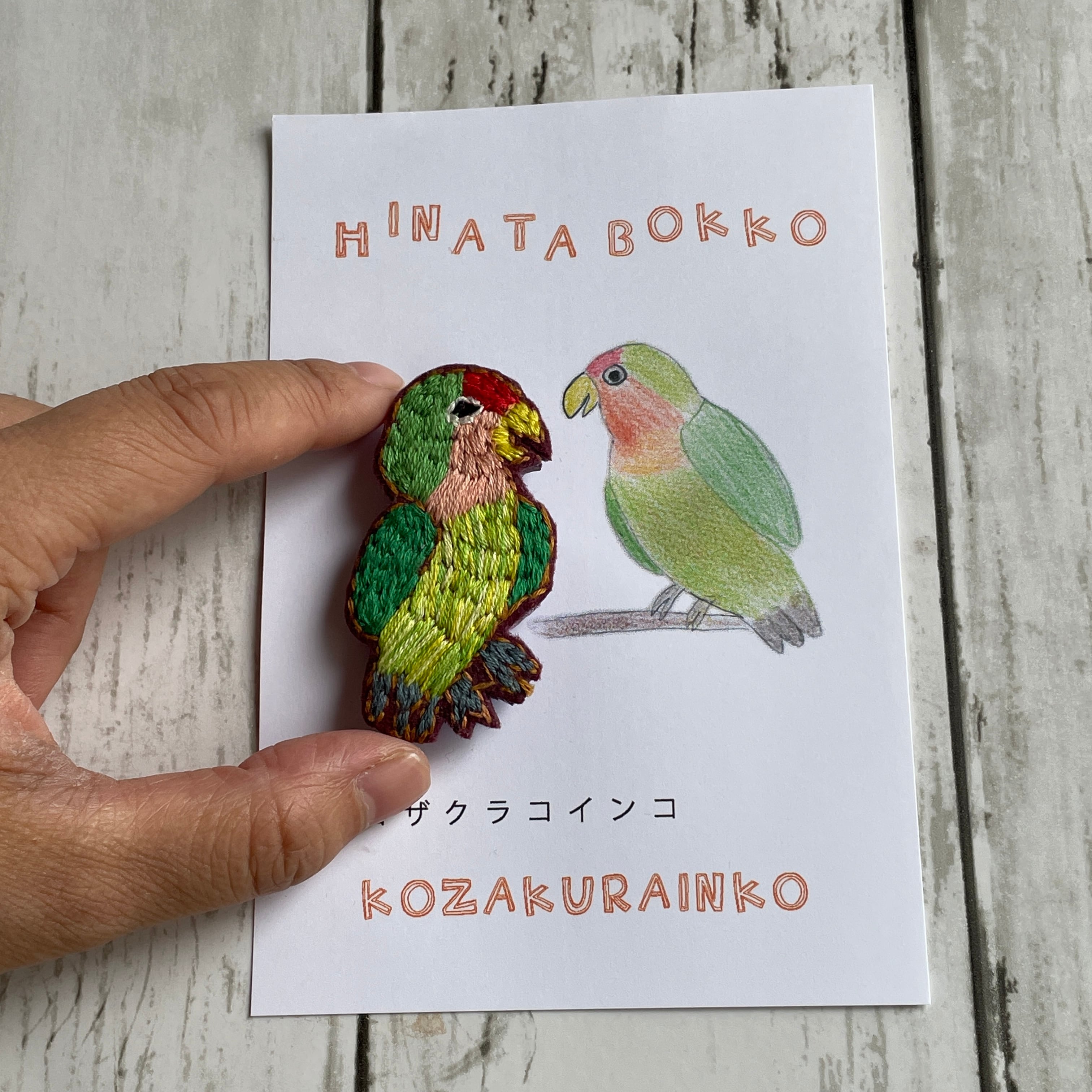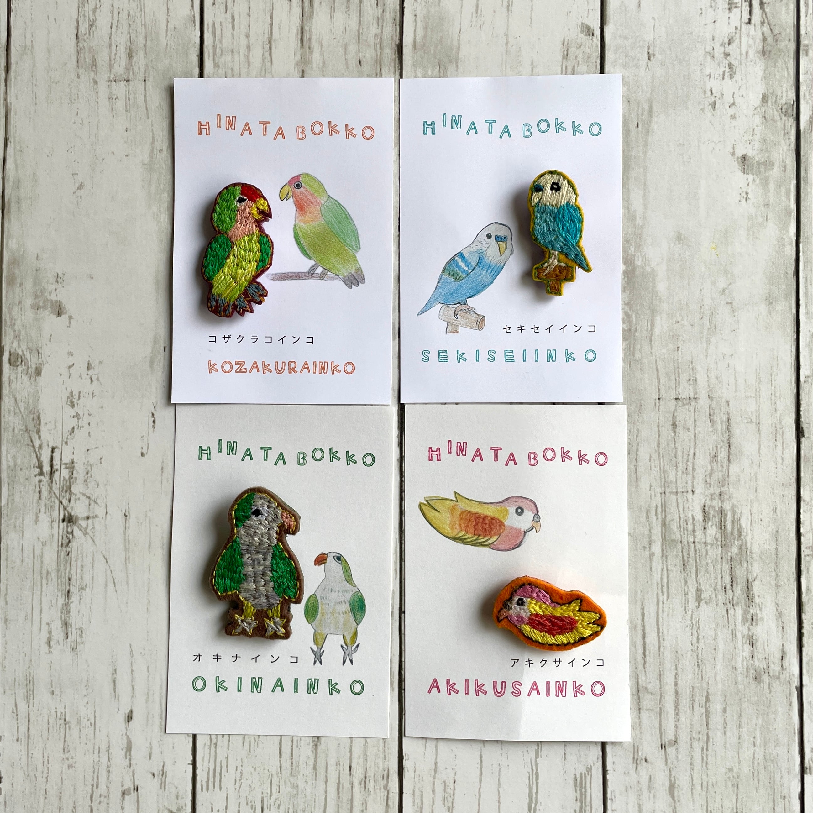 セキセイインコの「ひなた」ちゃんを飼っている、トリが大好きのひなたぼっこさんが作った、トリドリの刺繍ブローチ。