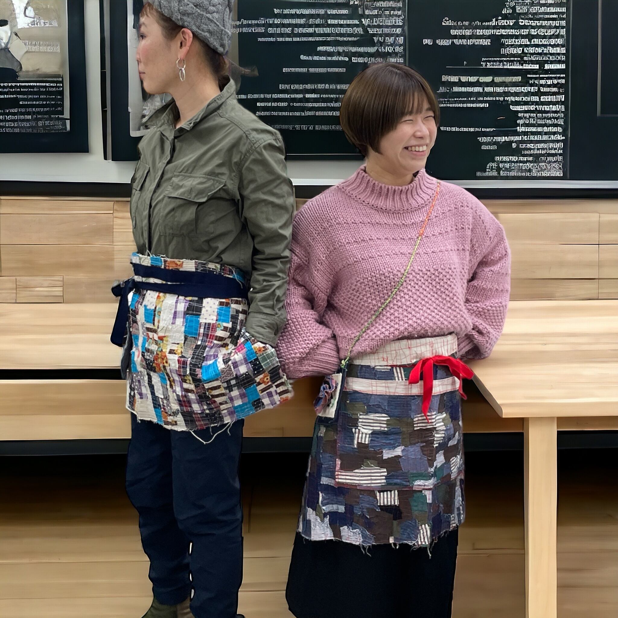 そうしてできた布コラージュ生地から、いろんなアイテムを作っていくのだけれど、このエプロンは出そうとしてもなかなかでない味わいのミシンステッチが最大の魅力。切りっぱなしの裾のラフさも。簡単に"できそでできない"エプロン。