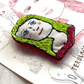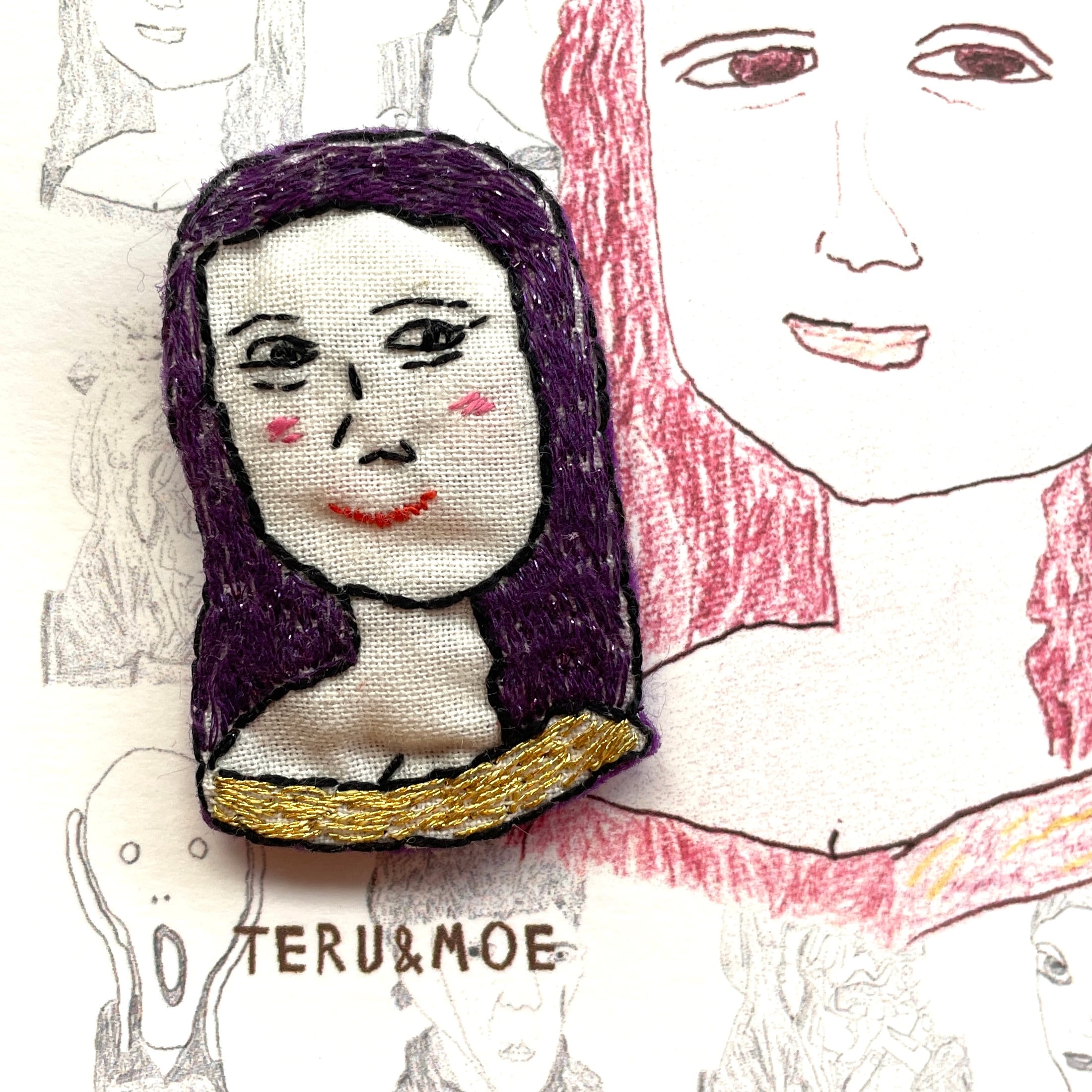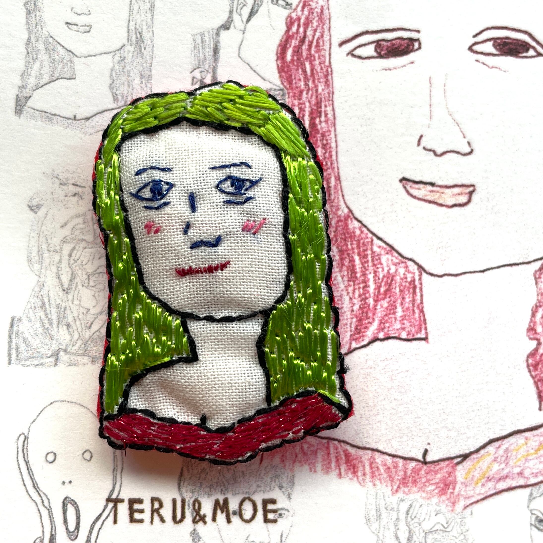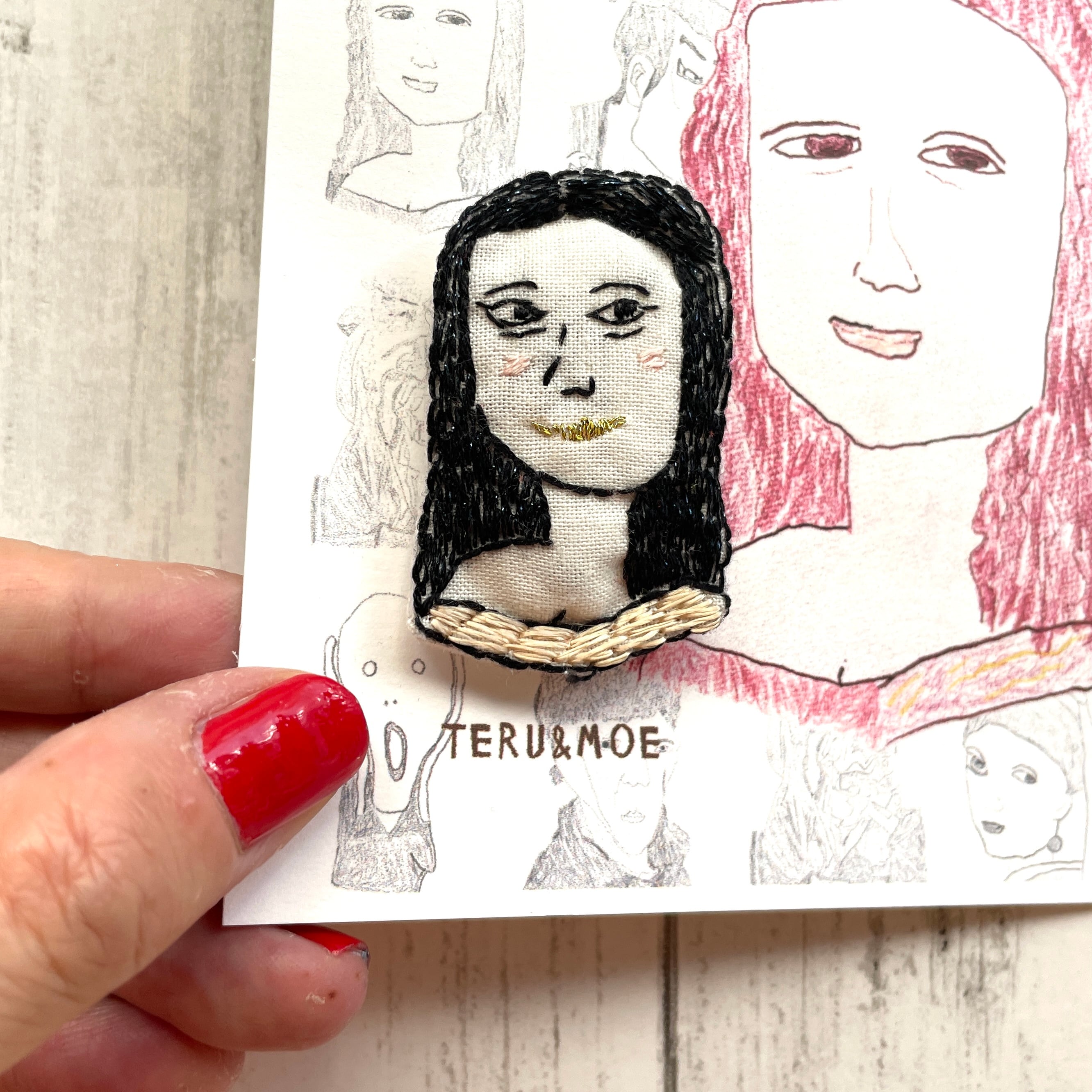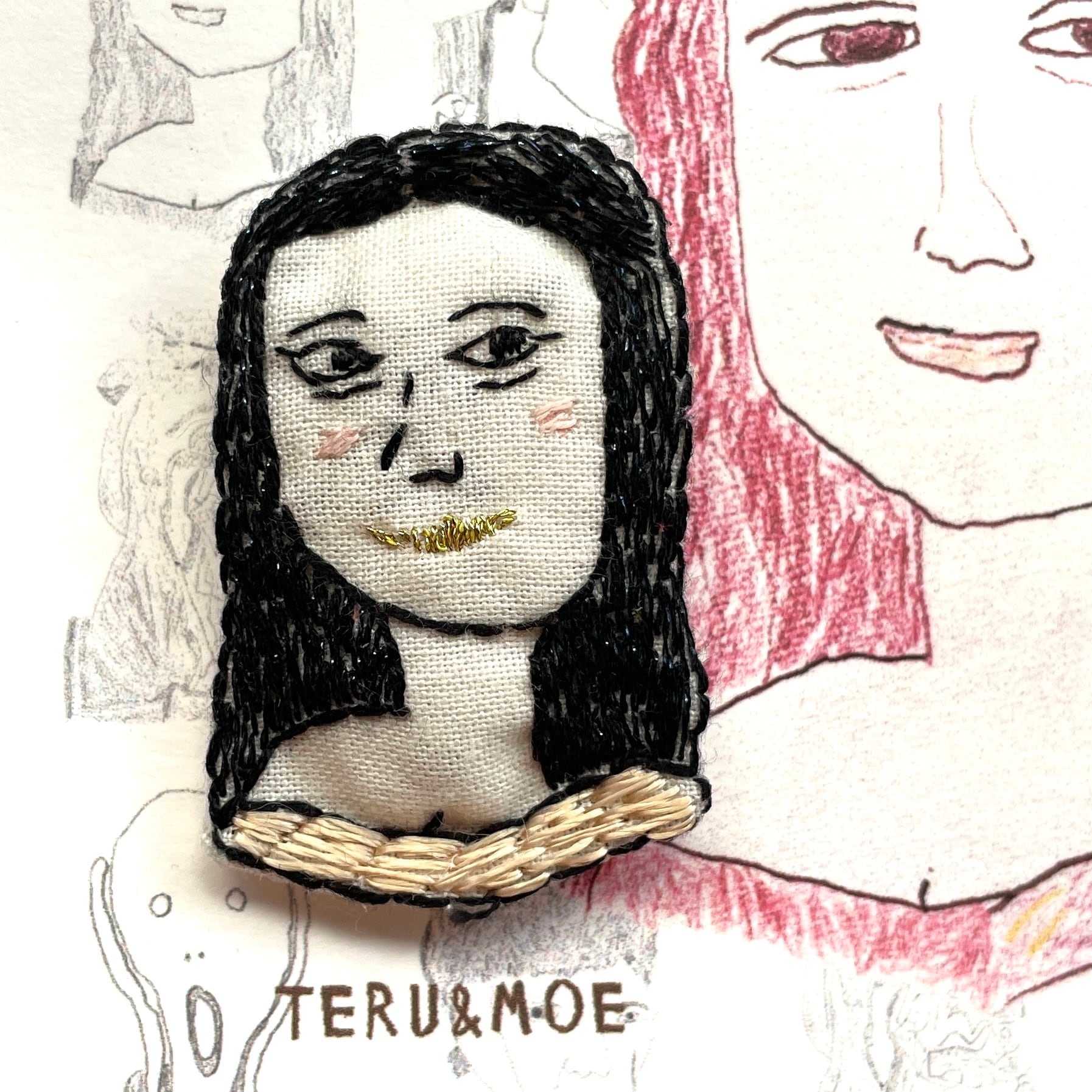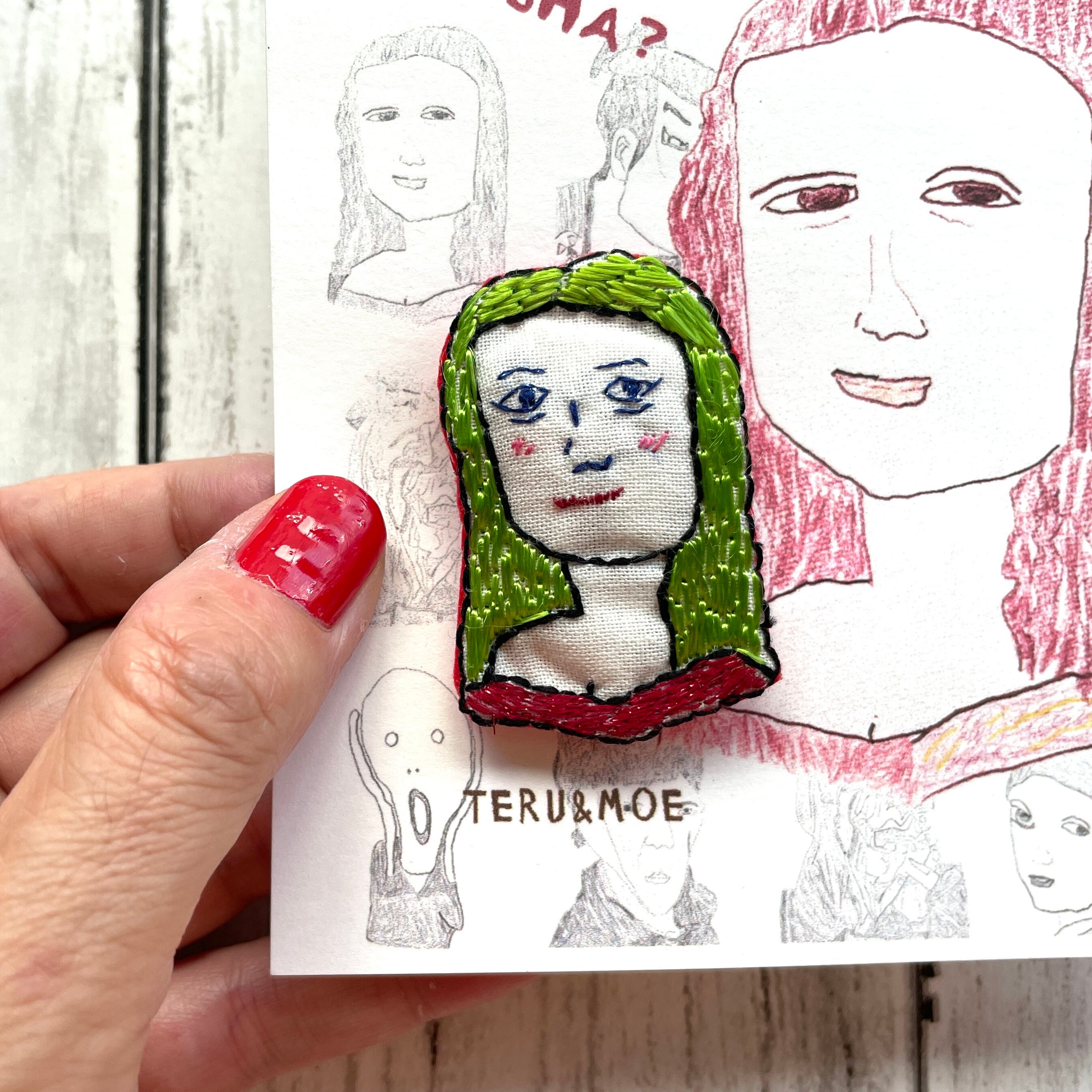 名前の通り、古今東西の名作をブローチにしたもの、なんだけど、ただ名画を見て刺繍したんじゃない。まず、独特なデフォルメ画でおなじみのMoeさんが、名画を模写し、それをさらにteruさんが刺繍した、というコラボなのだ。