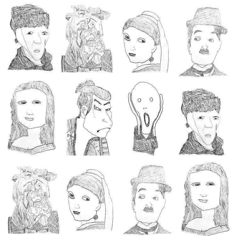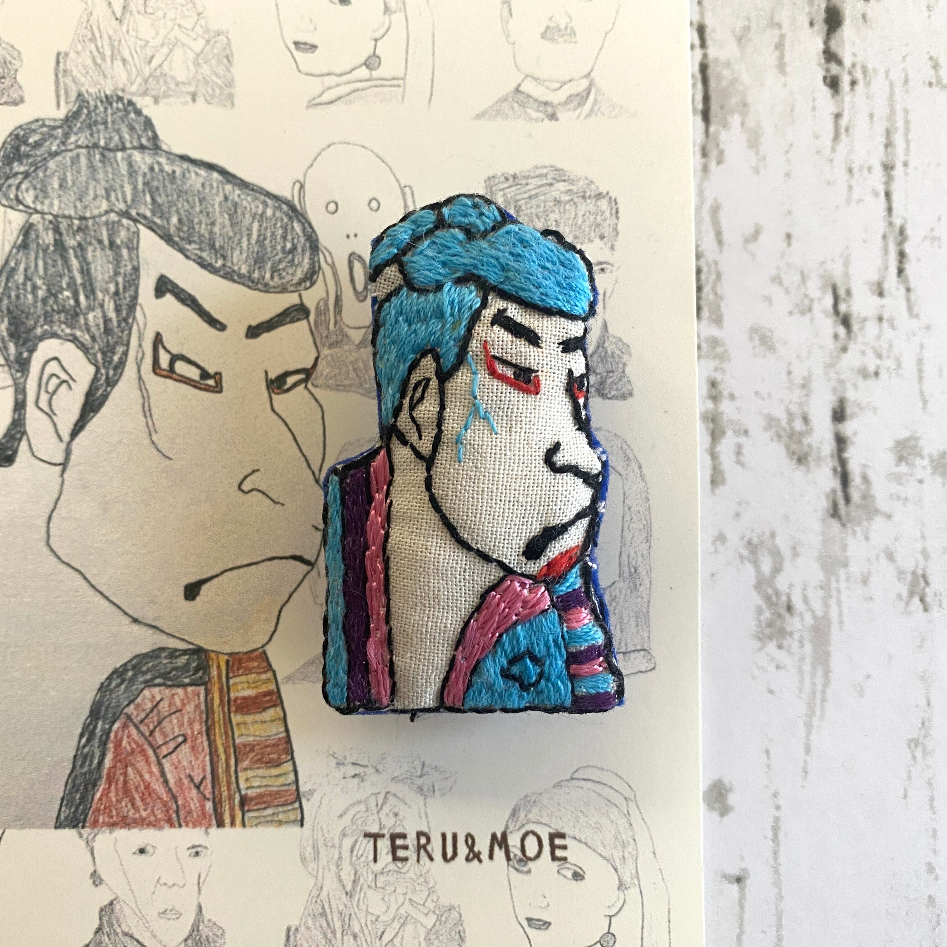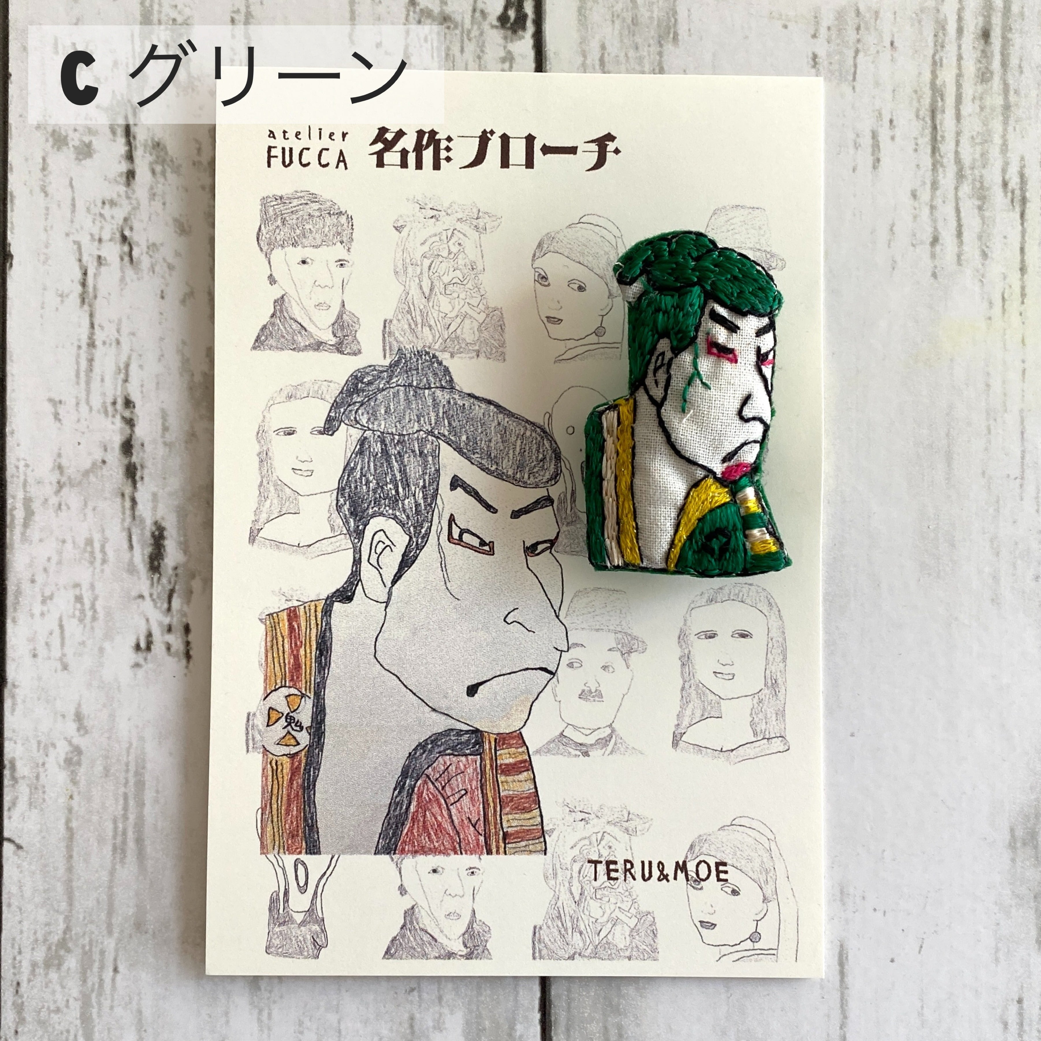 名前の通り、古今東西の名作をブローチにしたもの、なんだけど、ただ名画を見て刺繍したんじゃない。まず、独特なデフォルメ画でおなじみのMoeさんが、名画を模写し、それをさらにteruさんが刺繍した、というコラボなのだ。